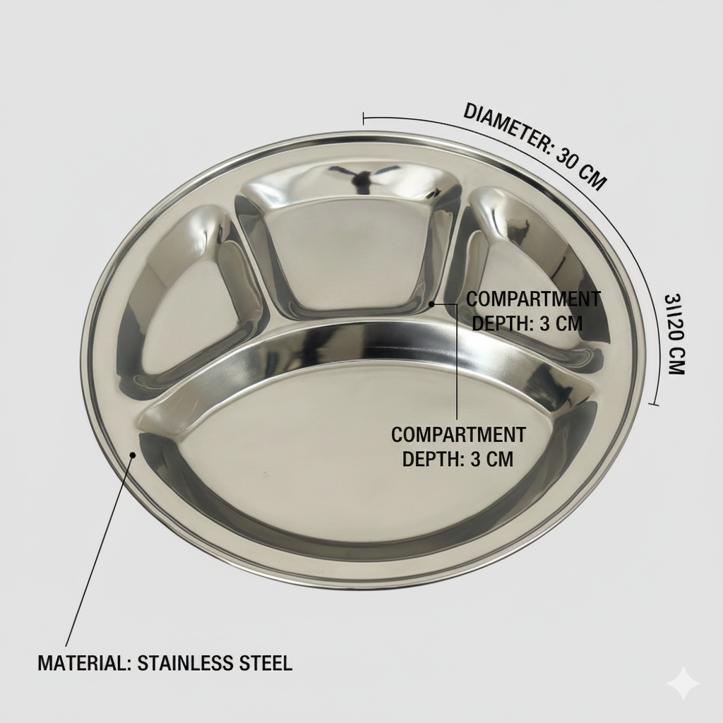 Premium quality stainless steel circular plate designed with multiple food compartments for hygienic and organised serving. Ideal for daily meals.