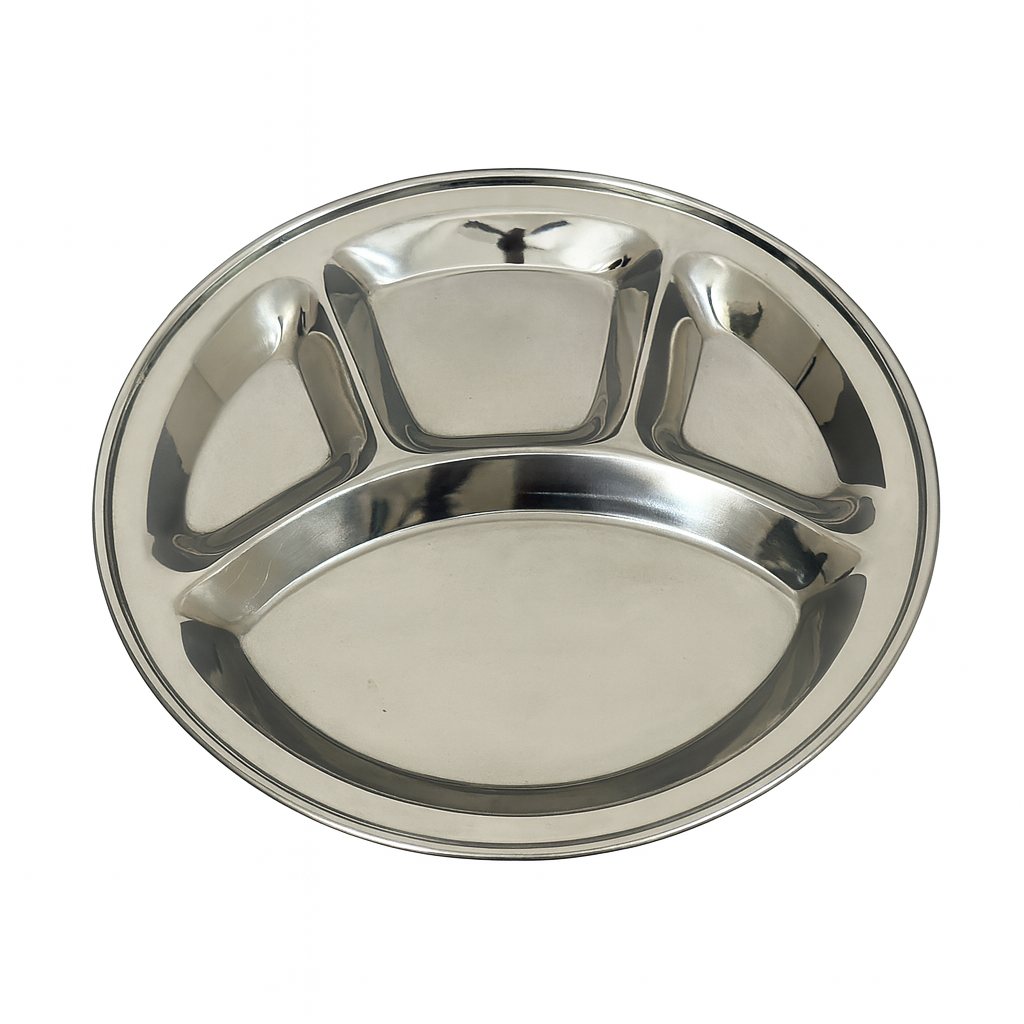 Premium quality stainless steel circular plate designed with multiple food compartments for hygienic and organised serving. Ideal for daily meals.